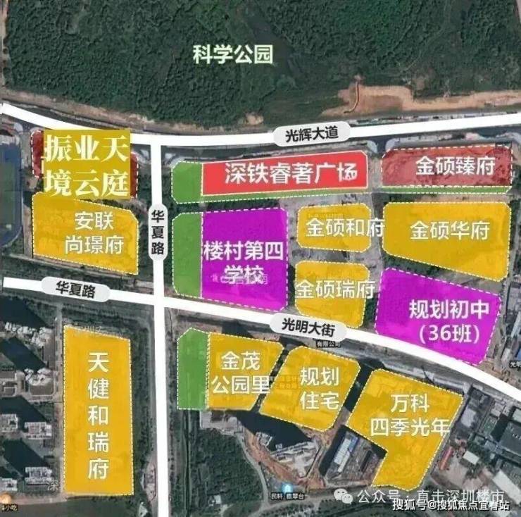②中小学:光明是一个社区对应多所学校,周边有10+个学校环绕。4月底刚揭牌的学校—深圳外国语学校光明学校(集团)楼村第四学校(暂定名),45班的九年一贯制学校,就在项目南侧。