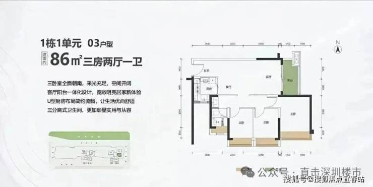 86㎡的3房2厅1卫,1栋1单元03户型,设计的是竖厅格局,客厅3.5米开间,LDKB一体化设计,进深9.95米,主卧全朝南,动静分区,U型厨房,卫生间三段式分离,阳台1.5米进深,东南朝向。
