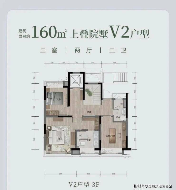 上叠院墅 V2 户型,约 160㎡(或 158.1㎡ ),三室两厅三卫。有私人电梯、双重玄关,约 6.1 米度假观景横厅,270° 三面采光 。约 30㎡L 型花园露台,能欣赏 270° 环幕景观。主卧奢阔,配备步入式衣帽间与独立卫浴,还有可拓展空间随心改造。