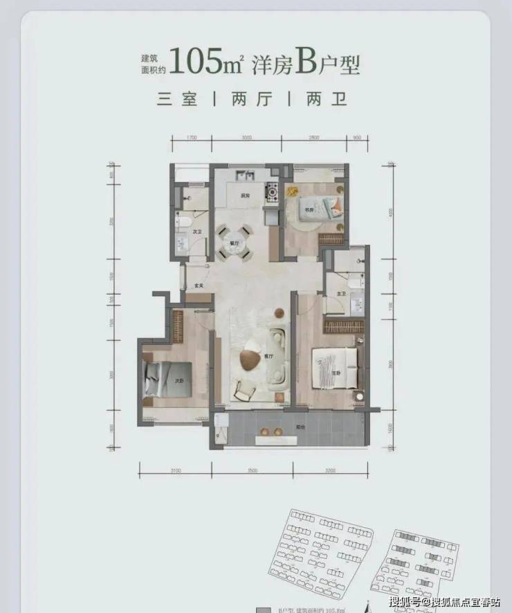 洋房 B 户型,面积约 105㎡(或 105.8㎡ ),同样三室两厅两卫。三开间朝南,南北通透,主卧联通约 6.7 米南向阳台。双厅竖向 LDKB 一体格局,空间利用率高,得房率也高。
