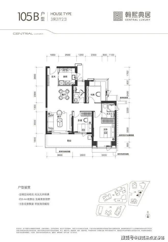 105㎡的3房2厅2卫,B户型(2栋3单元02/06户型),设计的是经典竖厅格局,客厅3.6米开间,LDKB一体化设计,三开间朝南,动静分区,3个卧室分别做到了主卧13.12㎡/次卧9.9㎡/次卧8.4㎡(包含墙体飘窗),客厅连接次卧出6.4米长的宽景大阳台,U型厨房,卫生间干湿分离,得房率约90%(包含赠送),正南或东南朝向。