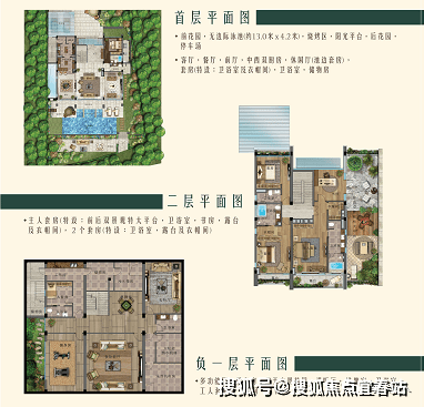 【J户型】建筑面积444.13㎡;室内使用面积约570㎡;阳台赠送约50㎡;占地约800㎡;4室4厅6卫;地上二层,地下一层;单层净挑高4m;超大阳光平台;前入户停车花园,双车位;私家泳池花园层层叠加设计,配48㎡独立泳池,活动平台;烧烤区;前后花园设有独立入户门,业主可自由出入;步行2分钟即可到达沙滩海边。