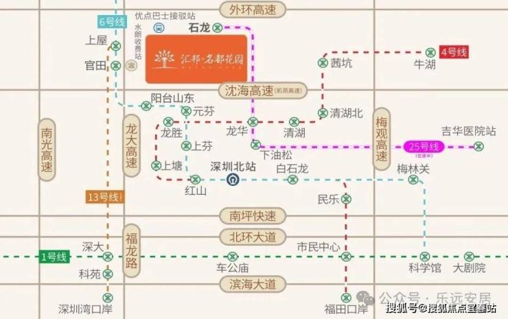 项目位于龙大高速水朗出口旁,紧邻地铁25号线石龙站(在建中,预计2028年通车);邻近地铁13号线(在建中),地铁6号线官田站,1站阳台山站 (在建中),5站深圳北站,7站抵达福田;畅享龙大、南光、广深、沈海 (机荷) 四大高速路网,出门即上高速,自驾通达全城。社区接驳优点巴士,6条短线直达6大地铁站 (龙胜、元芬地铁站接驳已开通),3条快线直达车公庙/大剧院/科技园等中心区。