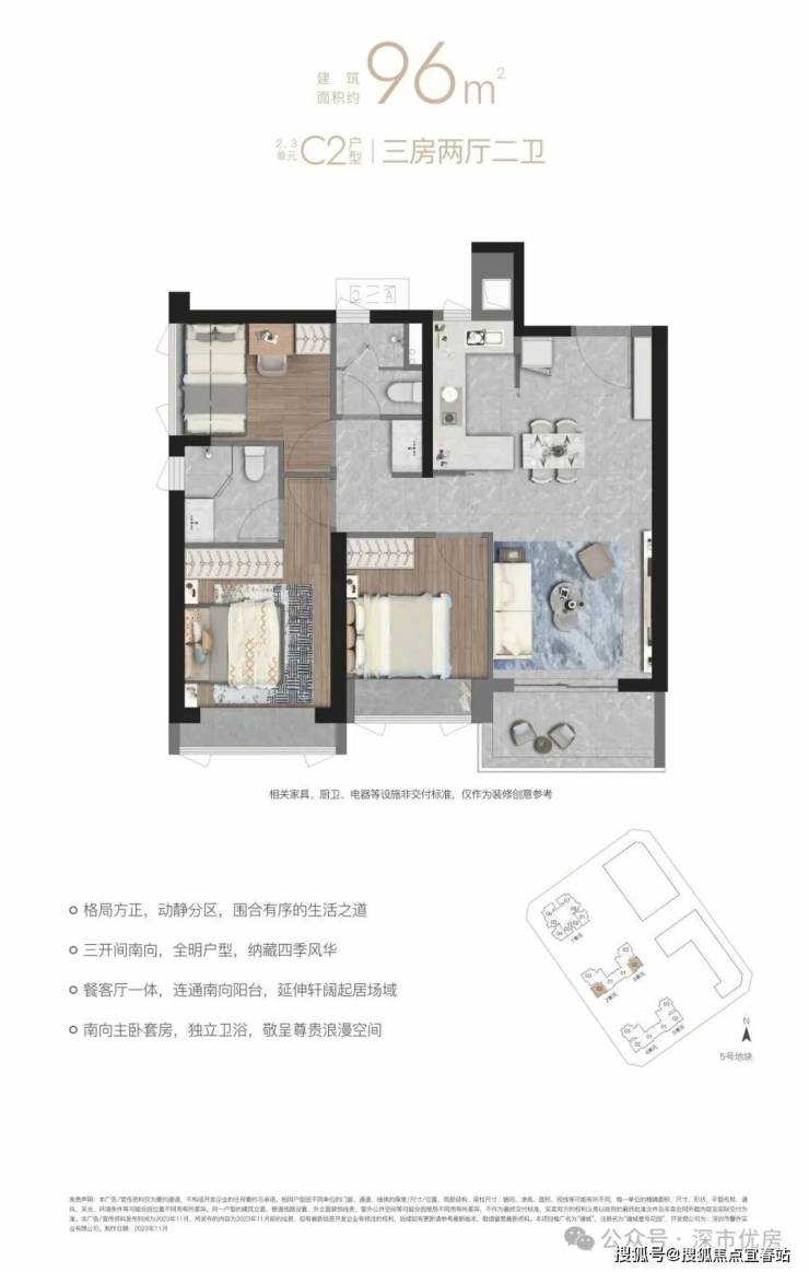 ❸96平标准3房,户型方正,三开间朝南,动静分区,全明格局。