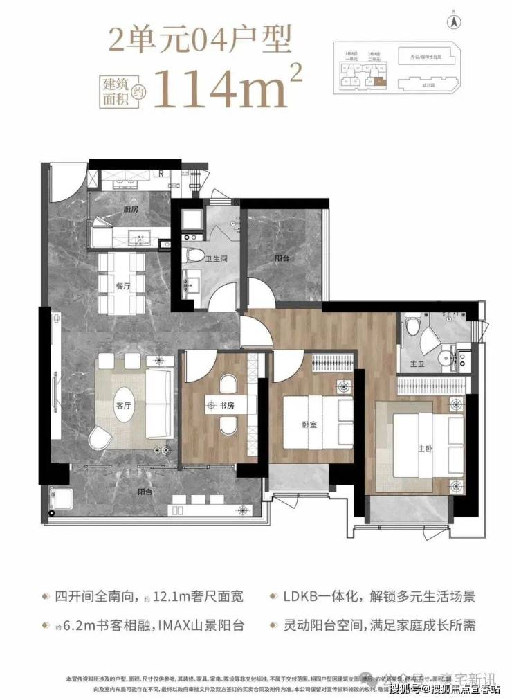 •建面约77-114㎡高使用率户型,设计独立入户空间,保证居住私密性;南北通透的格局,让室内空气时刻流通;LDKB一体化设计,打通客厅、餐厅、厨房与阳台,拓展生活空间,满足家人互动、休闲娱乐等多种需求,每一处细节都尽显匠心。