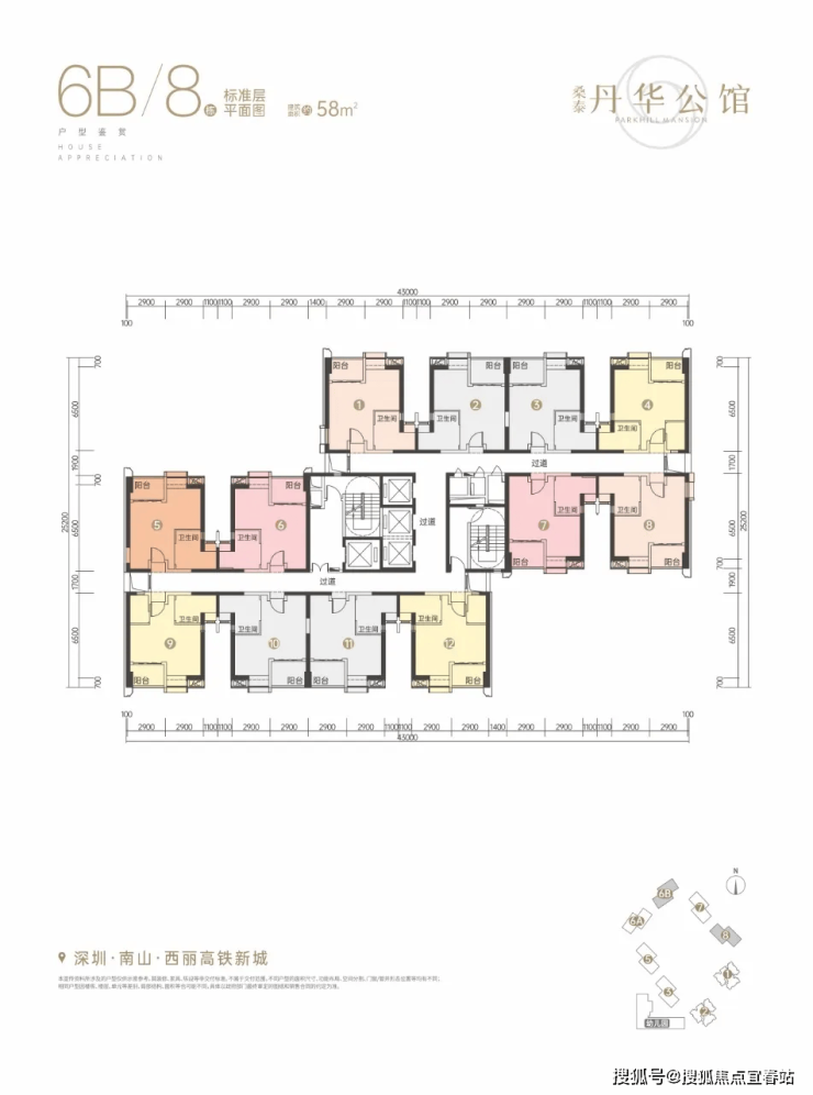 户型方正,明厨明卫设计,配有独立阳台,6A、6B栋西南方向单位可看西丽生态公园景观。需要注意是层高3.9米做成复式,下面约2米2,上面约1米5,实用性一般,更像"2房+阁楼",适合预算有限、想上车南山的刚需。
