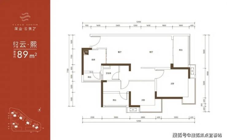 89㎡的3房2厅1卫,E2户型,设计的是竖厅格局,客厅3.6米开间,LDKB一体化设计,3个卧室分别做到了主卧13.5㎡/次卧9.54㎡/次卧8.1㎡(含墙体飘窗),L型厨房还带1个小生活阳台,卫生间三段式分离,得房率:79.89%(不含赠送),东南/西南或正南朝向。