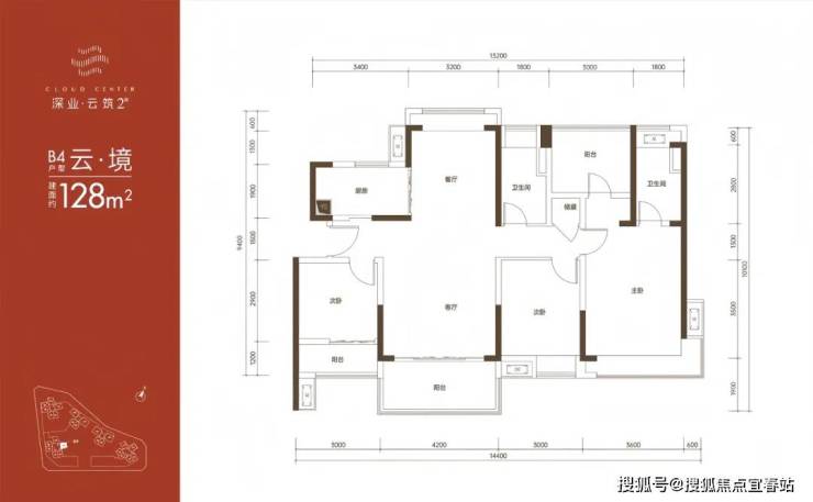 128㎡的4房2厅2卫,B1户型,仅5栋B单元的03号房才有,设计的是竖厅格局,南北通透双阳台,客厅4.2米开间,餐客厅一体化设计,4个卧室分别做到了主卧19.44㎡/次卧12.3㎡/次卧12㎡/次卧10.5㎡(含墙体飘窗),U型厨房,卫生间干湿分离,得房率:79.71%(不含赠送),大阳台主朝正南向。