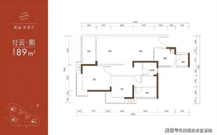 89㎡的3房2厅1卫,E3户型,仅4栋/5栋A单元/7栋的03号房才有,设计的是竖厅格局,客厅3.6米开间,LDKB一体化设计,3个卧室分别做到了主卧13.3㎡/次卧9.34㎡/次卧8.4㎡(含墙体飘窗),二字型厨房还带1个小生活阳台,卫生间三段式分离,得房率:79.89%(不含赠送),西南朝向。
