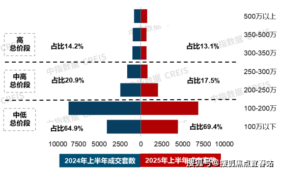 从成交总价结构看,200万以下产品成交套数占比69.4%,较2024年同期上升4.5个百分点。200-300万产品成交套数占比17.5%,较2024年同期下降3.4个百分点。300万以上产品成交套数占比下降至13.1%。