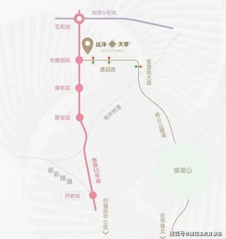 项目交通十分便利,楼下的光雅园站有地铁坂田线(10号线),南北走向通达福田至龙岗平湖,当中路过福田中心、华为一带产业聚拢区都是不少大厂人的通勤必经之路,还能直达福田口岸到香港。1站到五和枢纽站可换乘环中线(5号线)/ 深大城际,3站到贝尔路站可以转25号线,4站直达华为站。2站到坂田最大商业核心区星河World,3站到福田梅林,6站到福田岗厦北枢纽。