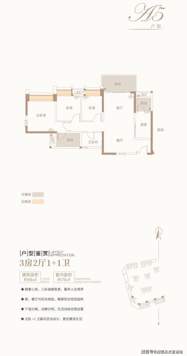 3房2厅1+1卫/约98平方米/精奢三房,面朝宽景
