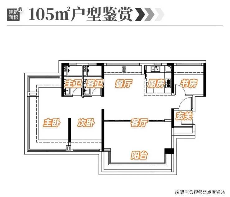 105㎡南北通透四房,餐客一体设计搭配双阳台,主卧套房配备步入式衣帽间,既能满足多孩家庭居住需求,也能兼顾三代同堂的舒适度。