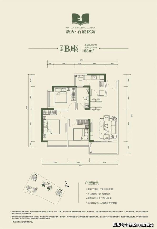 2栋B座一单元02、03户型、2栋B座二单元02、03户型:面积约为88㎡的3房2厅2卫