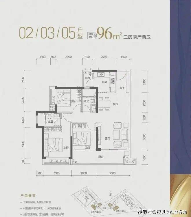约96㎡的3房2卫:该户型使用率高达约90%,同样是三开间朝南,配备约6.4米宽连廊式观景大阳台,从容品阅生活,悦享舒适温馨。