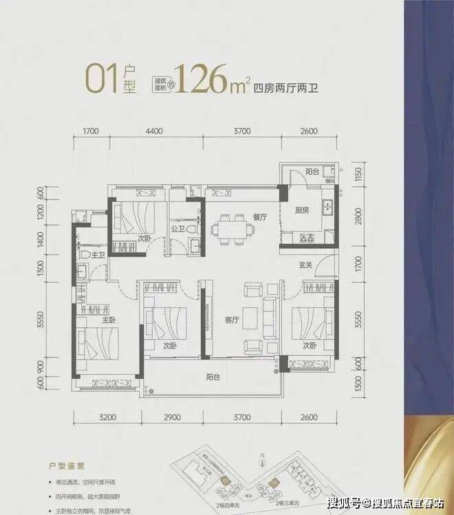 约126㎡的4房2卫:该户型使用率高达约91%,南北通透,四开间朝南,配备约6.6米宽连廊式观景大阳台,畔山揽境,敬显雍容气度。