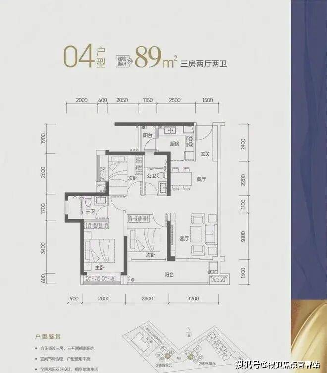 约89㎡3房2卫户型:该户型使用率高达约91%,三开间朝南,配备约6米宽连廊式观景大阳台,通风采光俱佳,拥享实用又不失精致的优越生活。