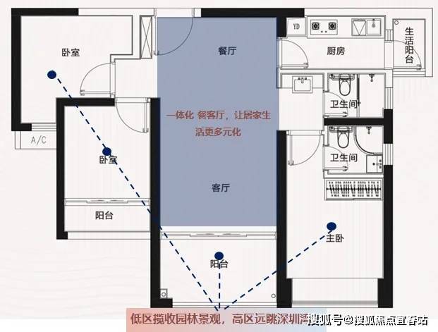阳台阔绰:前海稀缺在售89㎡三房两卫三阳台,客厅阳台进深1.9米,揽收城园双景