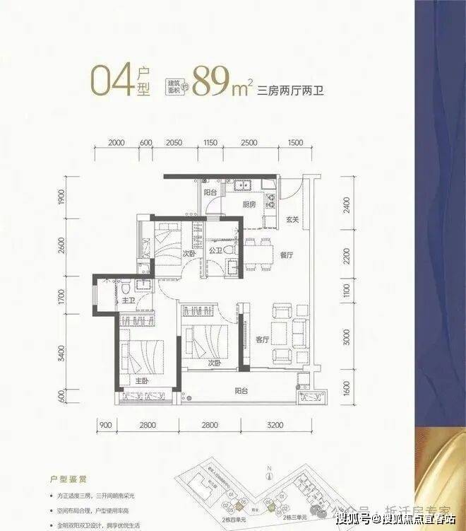 约89㎡3房2卫户型: