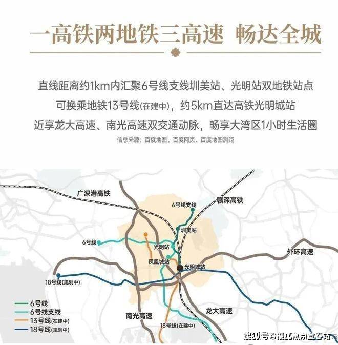 交通配套:项目距离地铁6号支线“圳美站”约900米,6号线光明站距离约1.2公里,3站到凤凰城站可换乘13号地铁线,5站到光明城站,这里可以换乘光明城高铁站,7站到宝安上屋站,12站到南山西丽留仙洞,15站南山高新园,19站到后海。