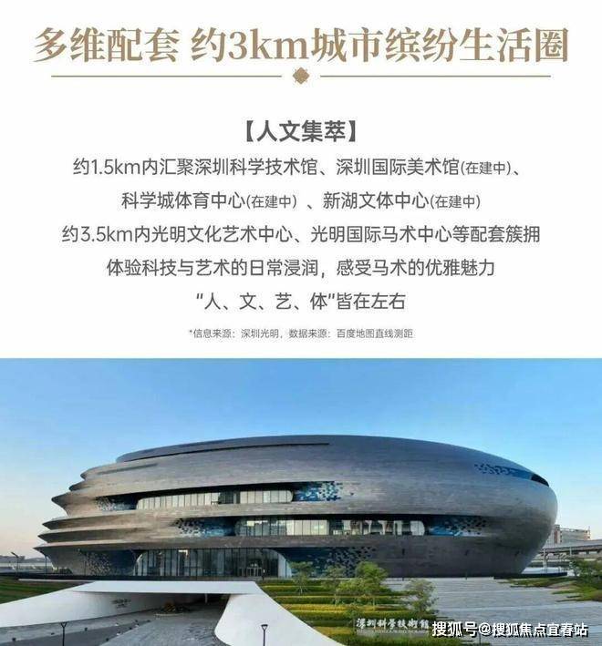 其他配套:约1.5km内汇聚深圳科学技术馆、深圳国际美术馆(在建中)、科学城体育中心(在建中)、新湖文体中心(在建中),约3.5KM内光明文化艺术中心、光明国际马术中心等配套簇拥。体验科技与艺术的日常浸润,感受马术的优雅魅力,“人、文、艺、体”皆在左右。