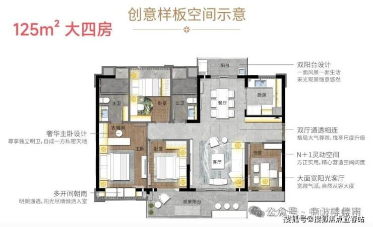 125㎡四房两卫:四开间朝南,南北双阳台对流,主卧套房设计,彰显改善品质