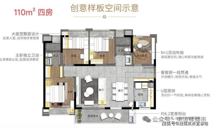 110㎡四房两卫:南向横厅+全景阳台,空间利用率高,适合多孩家庭