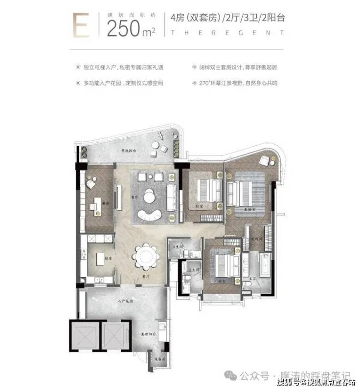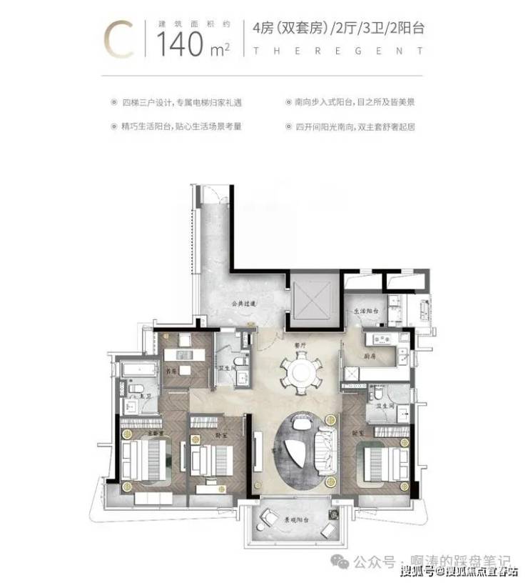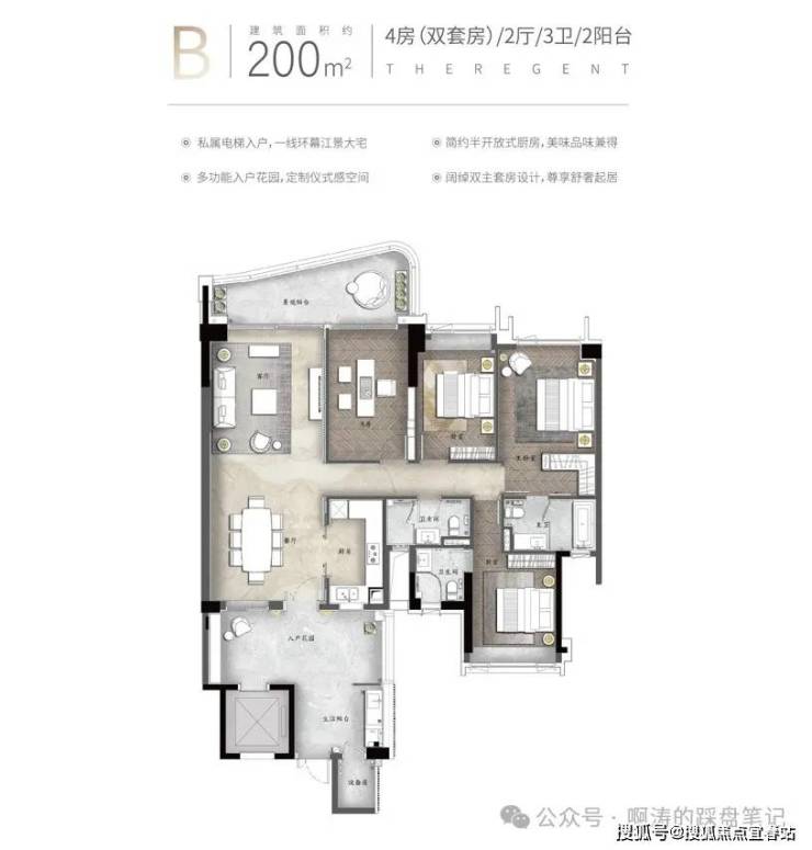 产品亮点:私家电梯入户、约3.4米层高、动静分区南北对流、约6.8米挑空餐客厅、中西双厨、三套房设计、部分房间带阳台设计