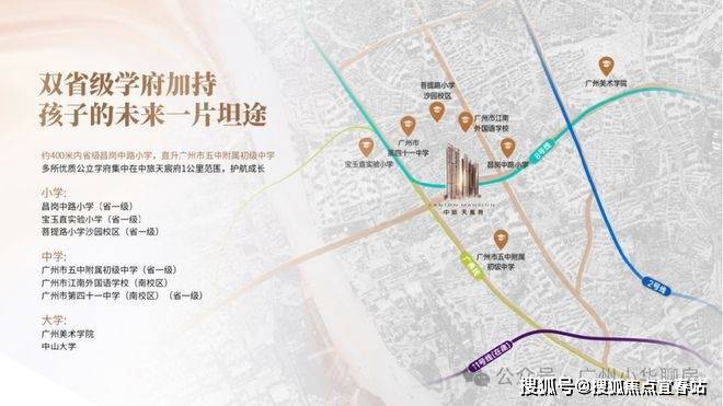 项目位于海珠区最强教育板块,根据广州市海珠区教育局政府信息公开网站,《2022年海珠区公办小学招生服务地段表》中显示,项目所属沙园街橡胶新村社区,直接对口省一级昌岗中路小学。同时,《2022年广州市海珠区初中招生问答》中显示,昌岗中路小学直升广州市五中附属初级中学。(注:学区地段规划以及小升初直升信息以教育局最新公布信息为准)