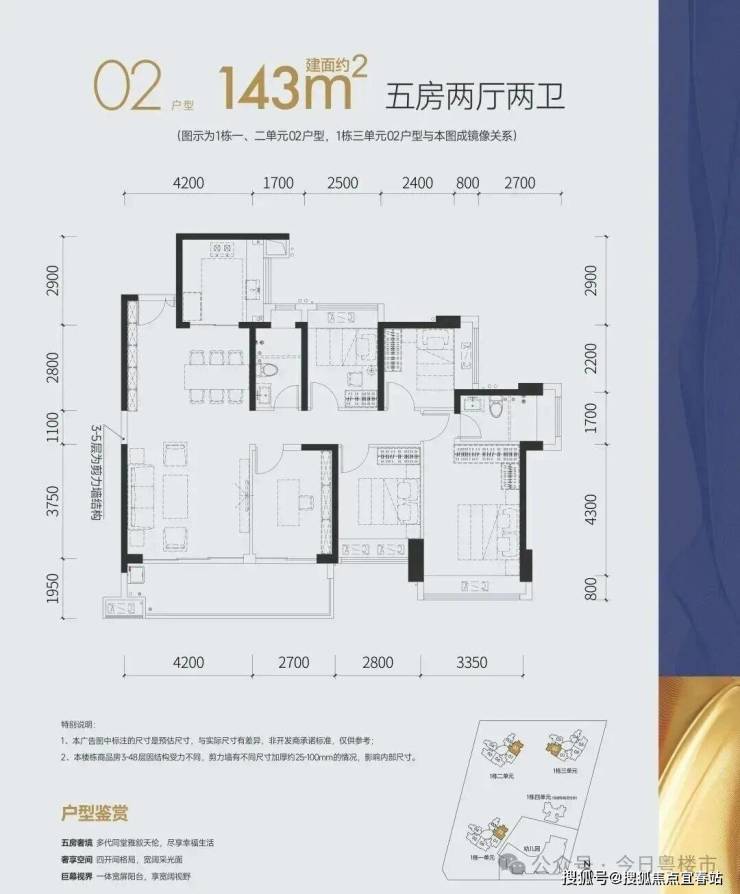 143㎡的5房2厅2卫,设计的竖厅格局,客厅4.2米开间,四开间朝南,5个房间分别是3.35米/2.8米/2.7米/2.5米/2.4米的宽度,客厅连接卧室带6.9米长大阳台,U型厨房,得房率:77.74%(不含赠送),有东南或西南朝向。