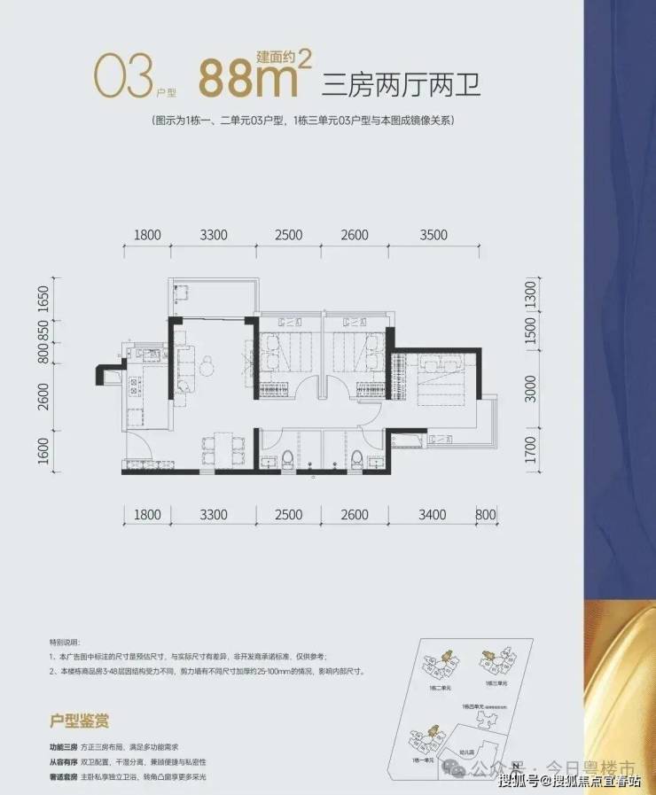 88㎡的3房2厅2卫,设计的竖厅格局,客厅3.3米开间,3个卧室分别是3.5米/2.6米/2.5米的宽度,主卧L型飘窗,L型厨房,得房率:77.73%(不含赠送),有西北或东北朝向
