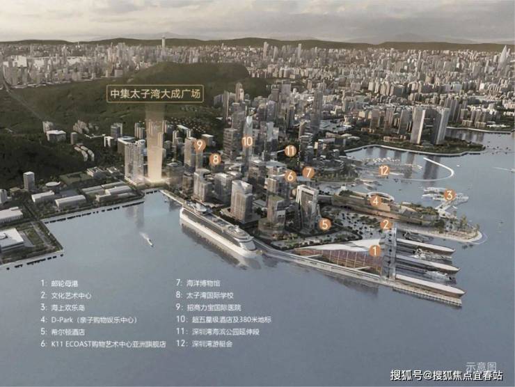 蛇口联动前海、深圳湾,构成三大千亿级经济中心格局。蛇口国际海洋城战略,太子湾作为主要承载区,对标美国哈德逊城市广场,约170万㎡滨海都会区大器已成