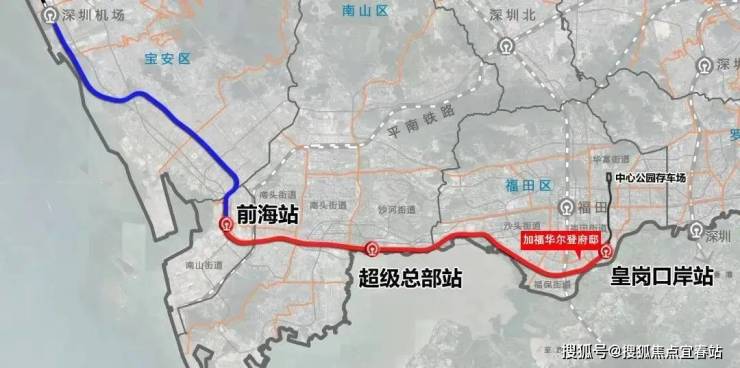 轨道:穗莞深城际轨道2站直达前海,联通两大深港合作区;穗莞深城际(建设中)延长线——穗莞深城际前海至皇岗口岸段设有皇岗口岸站,途径南山、福田等地,建成通车后2站到前海,1站到深圳湾总部基地。