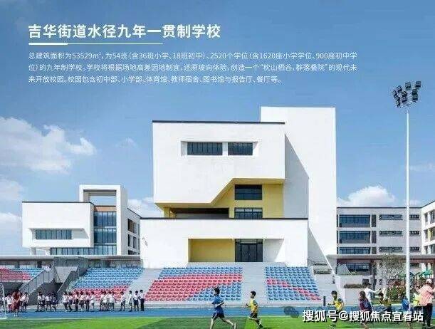 54班九年一贯制学校,提供2520个学位,总建筑面积约5.35万平方米,包含初中部、小学部、体育馆、教师宿舍、图书馆与报告厅、餐厅等。