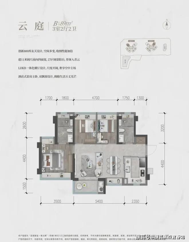 89㎡的3房2厅2卫,设计的是横厅格局,客餐厅总宽5.4米,南北通透户型,全屋飘窗设计,超11米南向四面宽,U型厨房设计;