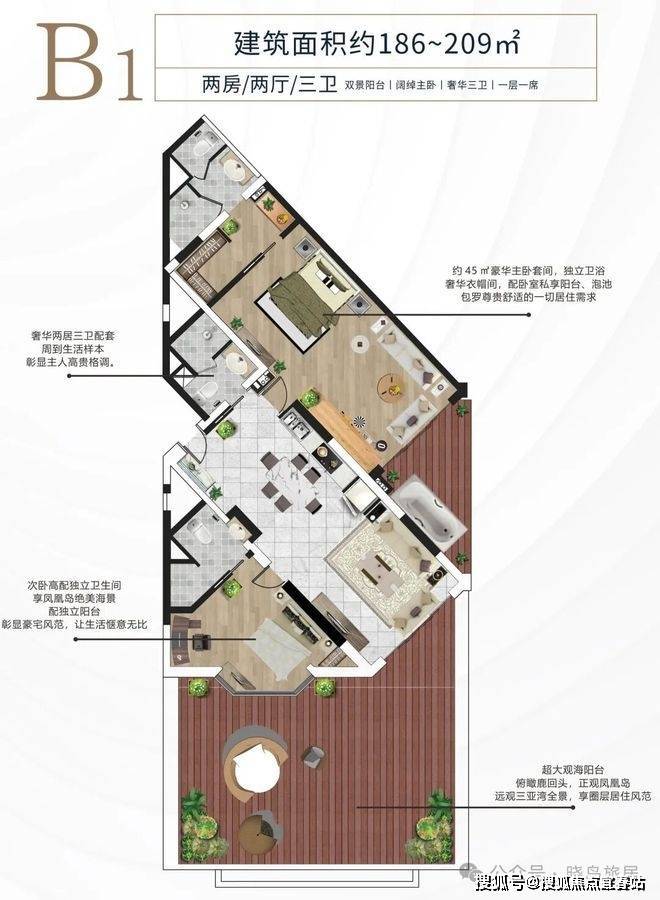 B1户型约186-209平方米 两房两厅三卫大阳台