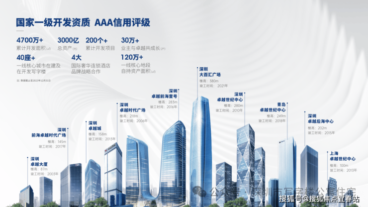 ———————————————————【优质房企】28载深厚积淀,荣获中国房地产23强,国家一级开发资质,AAA信用评级等多项荣誉。【实力卓越】战略布局全国一二线大中城市,累计开发200个+精品项目,布局地产开发、城市更新、资产运营、商企服务四大业态,成就CBD地标专家。【城市更新】多项荣誉:卓越集团作为全国第一家城市更新集团公司,荣获2020-2023年“中国房地产城市更新十强企业”TOP2等多项荣誉。开发数据:目前已完成36个立项项目,20+交地项目,布局福田岗厦、皇岗等城市核心区位。
