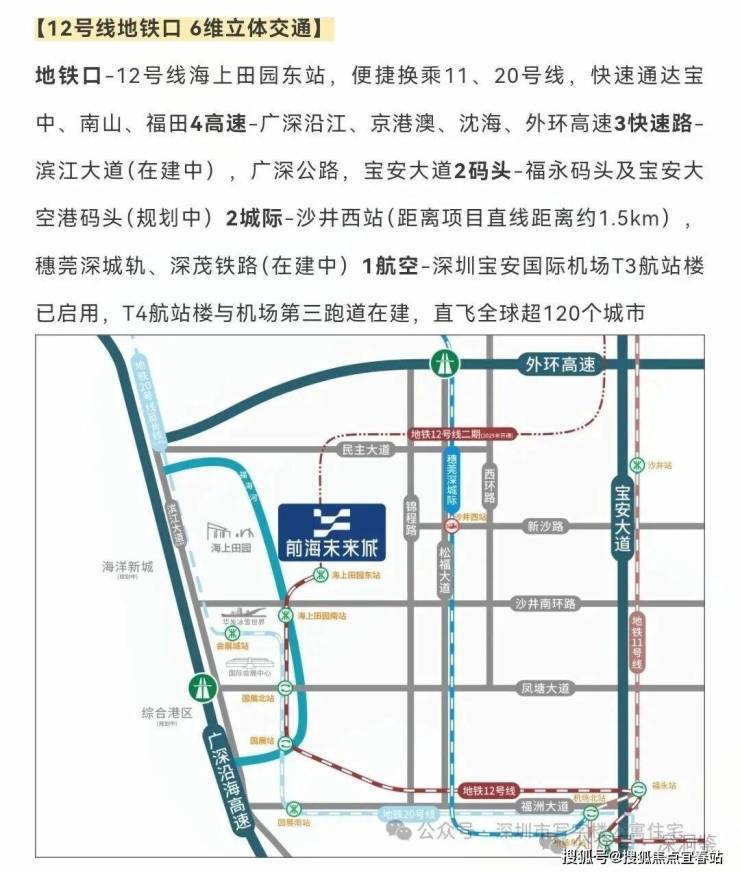 交通。已经通车的地铁 11号线,12号线,20号线一期,直达宝中、南山、前海、福田、蛇口中心。同时可以换乘1号线、5号线,除此之外还有地铁20号线的二期《修建中》,18号线《规划中》。同时,广深沿江高速、外环高速、京港澳高速等多条高速公路贯穿全区,深中通道、穗莞深城际线等重大交通项目在建,未来将进一步提升区域交通条件。