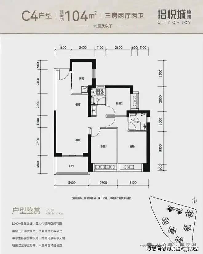 100平三房:设计的是竖厅格局,进门入户玄关,客厅3.4米开间,LDKB一体化设计,3个卧室分别做到了3米/2.9米/2.5米的宽度,U型厨房,公卫三段式分离,得房率:77.14%(不含赠送),阳台1.8米宽度,西南或东南朝向。