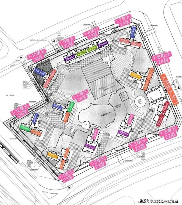 核心规划参数:项目总占地面积约4.25万㎡,总建筑面积约14.5万㎡,其中住宅12.5万㎡、商业1.83万㎡;容积率仅3.4,远低于周边项目5.4-8.5的普遍容积率,打造城芯低密舒居社区;规划12个单元(11个住宅单元+1个小区大堂),由22-24层小高层组成,采用围合式点式错位布局,保障户户朝南与景观均好性;总户数629套,梯户比为2梯2户(板楼,主力193-332㎡大平层)、3梯3户(塔楼,主力140-190㎡户型);总停车位1205个,车位比超1:1.9,充分满足多车家庭需求;产品为70年产权纯住宅,主打140-332㎡纯四房户型,精装交付,预计2028年底交付。