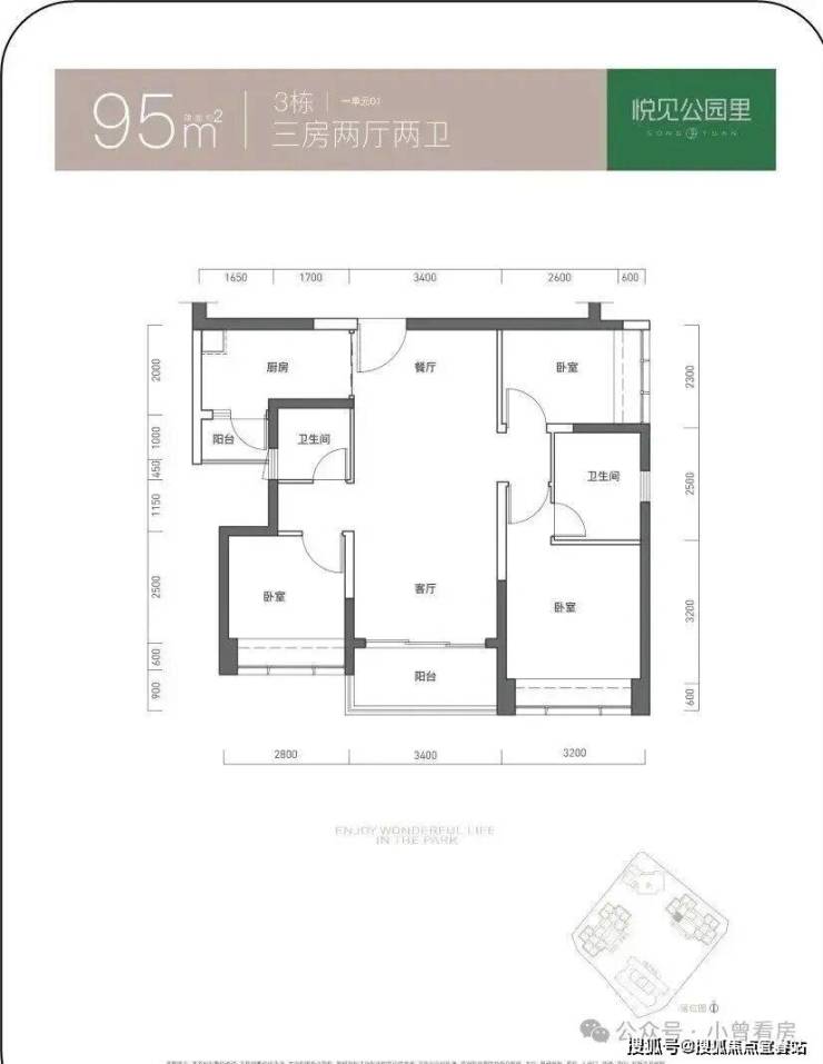 95㎡的3房2厅2卫,仅3栋1单元01户型,设计的是竖厅双龙抱珠格局,客厅3.4米开间,三开间朝南,3个卧室分别做到了3.2米/2.8米/2.3米的宽度,L型厨房带1个生活阳台,公卫三段式分离,得房率73.71%(不含赠送),西南朝向。