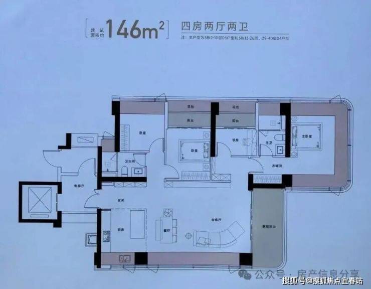 建面约146㎡户型,得房率约105%(包含赠送),东南朝向看海景景观。可视为127㎡户型的升级放大版。