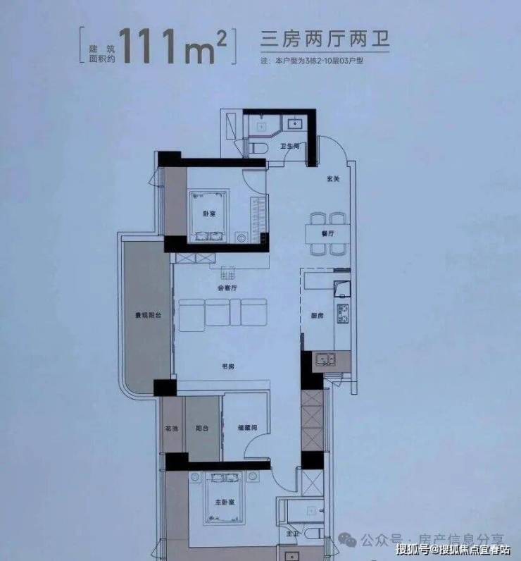 建面约111㎡户型,得房率约94%(包含赠送),西北朝向看一线梧桐山景观。跟102㎡户型布局有点像,也是长条形……