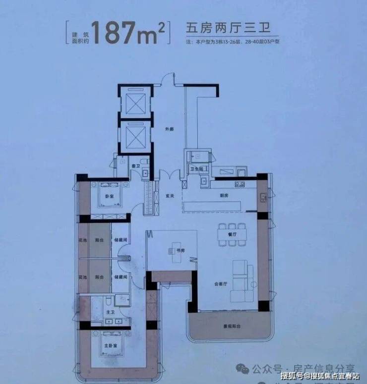 建面约187㎡五房两厅三卫,得房率约111%(包含赠送),西南朝向看海景景观。双套房设计。