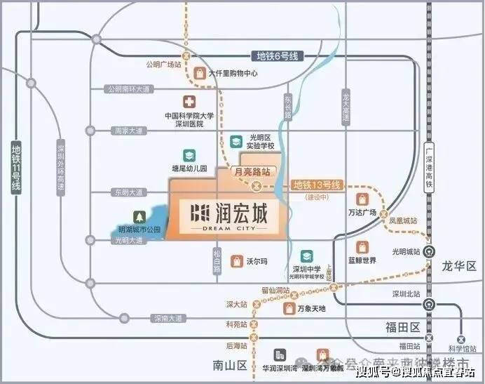 华润润宏城位于光明区凤凰街道塘尾社区,光明大道和东长路交汇处的西北侧,刚好在13号线“月亮路站”附近,北部接壤东周路。