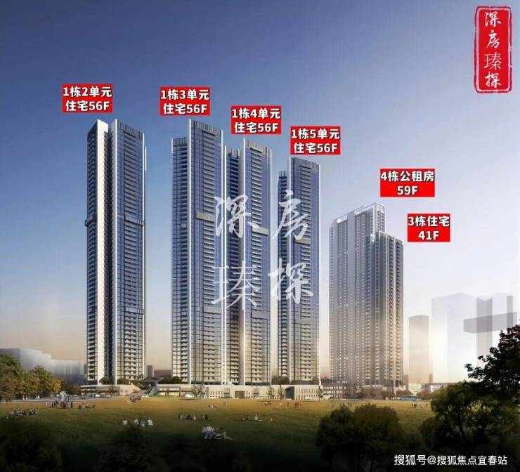 另一个01-02地块,总占地约1.23万㎡,总建筑面积约15.08万㎡,计容建筑面积约10.85万㎡,容积率为8.31,绿化率同样为40.01%,该地块由2栋41至59层高的住宅楼组成,其中3栋为41层的住宅楼,4栋为59层的公共租赁住房。此外,还有5栋是30层的办公楼,以及2栋是一所9班制幼儿园。