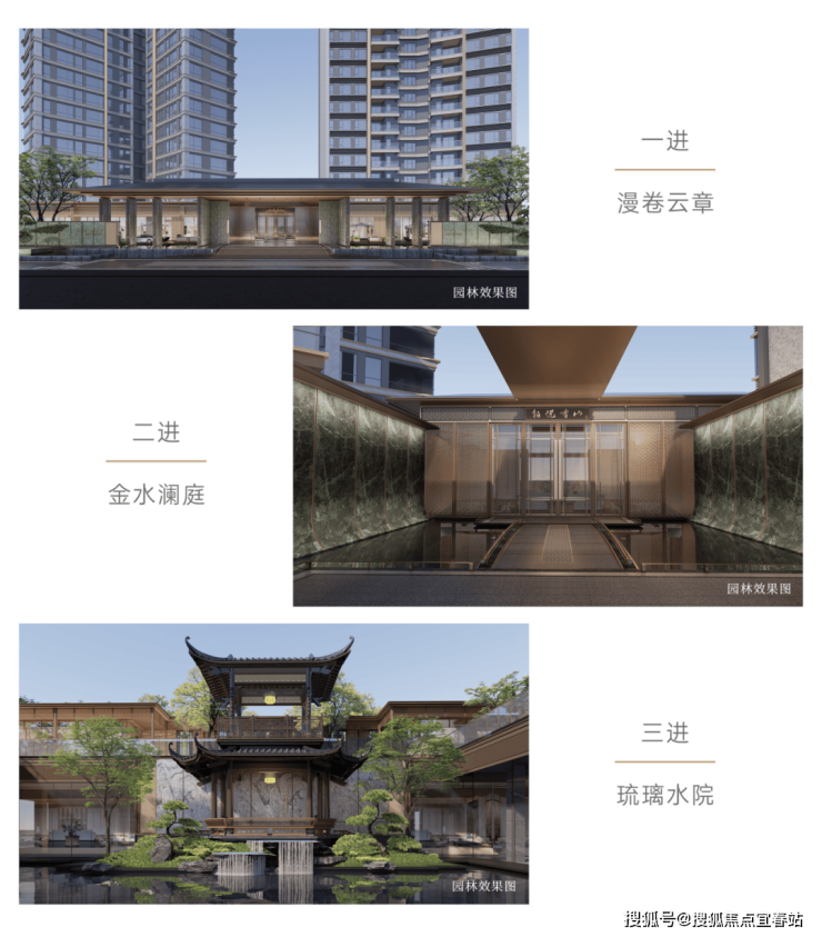 一进漫卷云章,苍劲古松迎客而立,九级石阶,延伸恢弘归家仪制。二进金水澜庭,玲珑金水桥,与天然石壁叠水相映成趣。三进琉璃水院,名亭名联如画铺展,飞虹溪谷窥见名园意趣。“一园三进,游园十乐”,层层递进礼序轴线,铸造无出其右的归家仪式感。