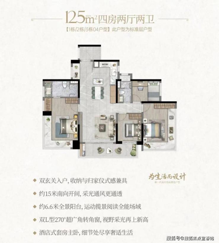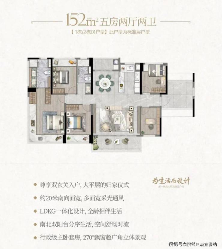 且配备双玄关入户、双阳台、 270°观景飘窗等配置。