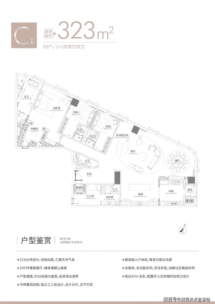 A户型:396㎡,3+1房2厅2厨5卫,西北向,全套房双主卧,次卧带阳台。