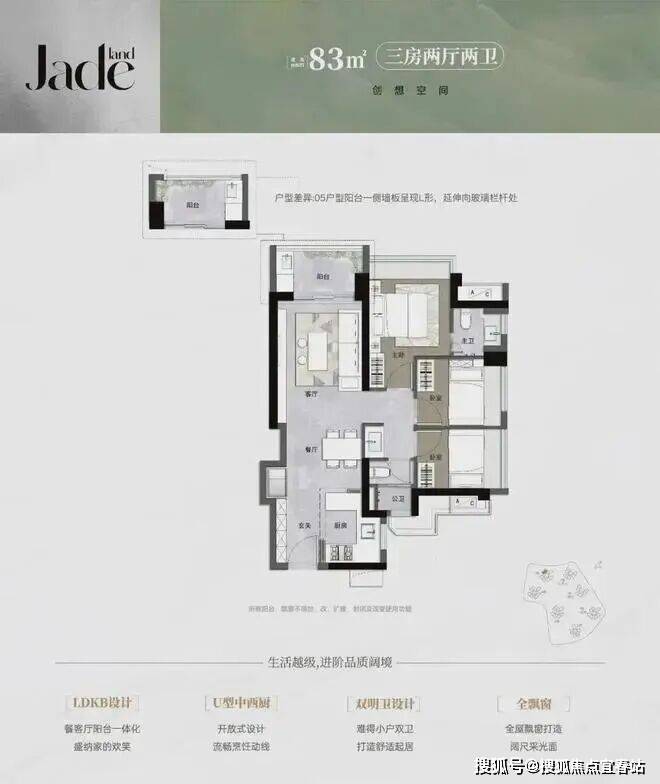 83㎡的3房2厅2卫,设计的是竖厅格局,进门入户玄关,客厅3.2米开间,LDKB一体化,S墙设计预留冰箱卡槽位,U型厨房,主卫少了淋浴,公卫三段式分离,得房率约90.33%(包含赠送),阳台西北朝向。